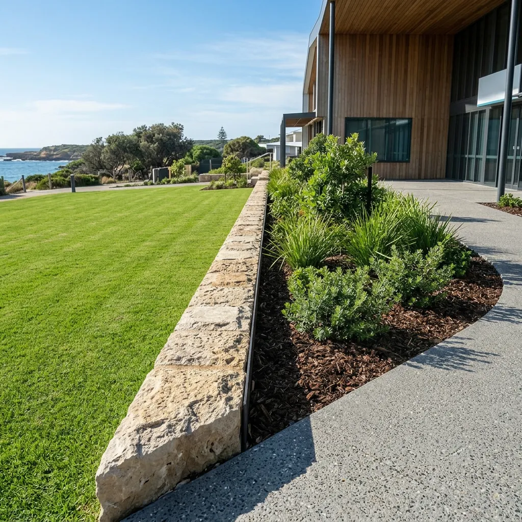 In a commercial setting, garden beds and lawns need clear, physical separation. We use commercial-grade steel, heavy limestone blocks, or concrete curbing to ensure mulch stays in the garden and grass runners do not invade the paths. This keeps the site looking tidy and drastically reduces the hours required for ongoing maintenance.