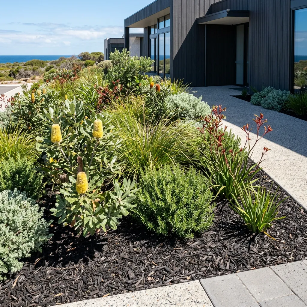 We build garden beds using heavily improved soil, then plant out with robust native and coastal species suited to the South West climate. These plants establish quickly, require less water, and handle the wind and sun well. Finished with a thick layer of premium mulch, these beds provide a clean, professional look year-round.