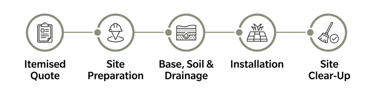 For open green spaces, we supply and lay commercial-grade turf varieties like Kikuyu and Couch that recover quickly from damage and handle heavy wear. We manage the full installation, including deep soil preparation, to ensure the root system establishes strongly.