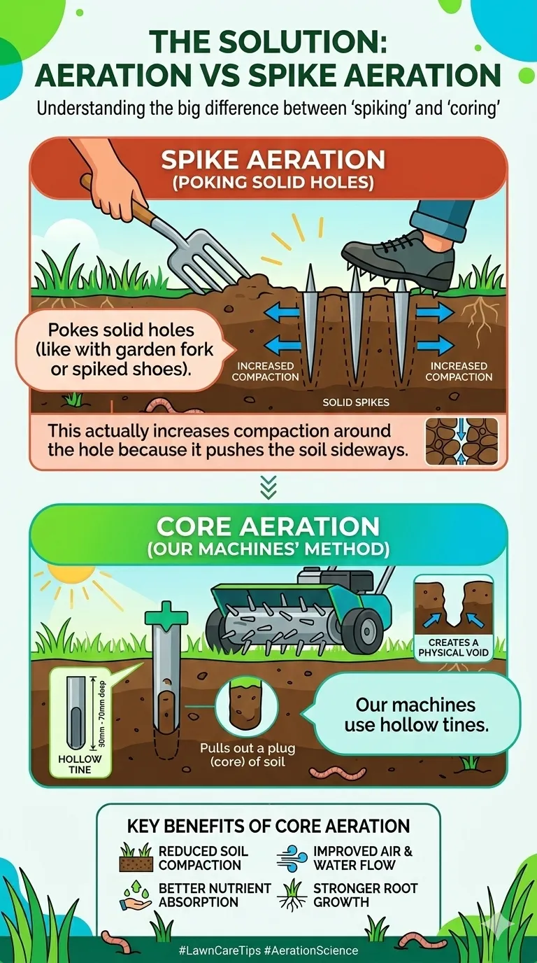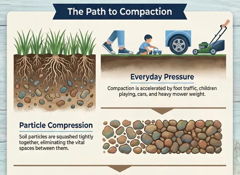Soil compaction is a silent killer. It happens naturally over time, but it is accelerated by foot traffic, kids playing, cars parking, and even the weight of the mower.