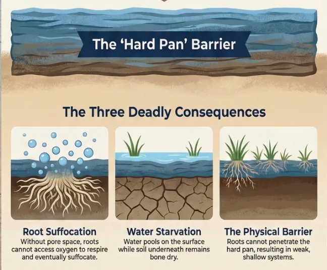 Roots physically cannot push through the hard pan. They stay shallow. Shallow roots mean the lawn is weak and dries out the moment the sun comes out.