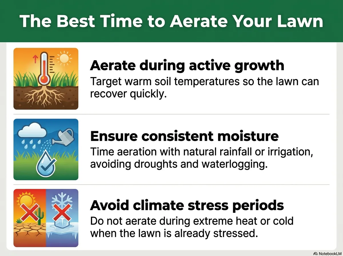 We avoid aeration in the middle of winter (lawn is dormant) or the absolute peak of a heatwave (too much stress).