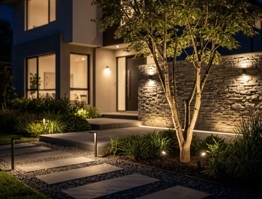 Front yards take on a second life at night. We can incorporate low-voltage garden lighting to uplight feature trees or wash light over a textured wall. This not only looks stunning but improves security and safety.