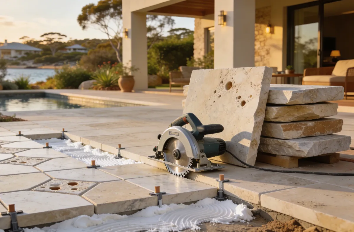 For a high-end, resort finish. Travertine (French Pattern or rectangular) adds texture and luxury. We handle natural stone with care, using specific cutting blades and often laying on a mortar bed or adhesive for stability.