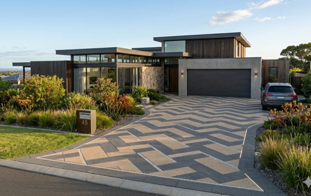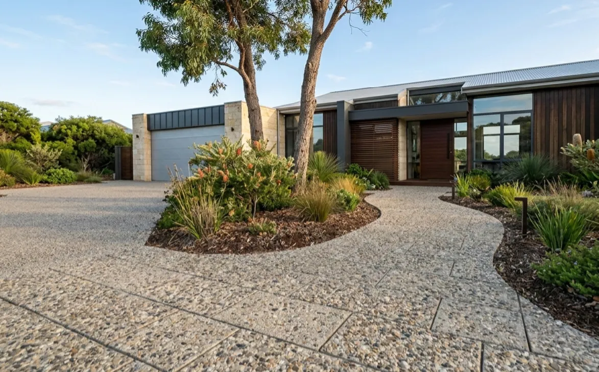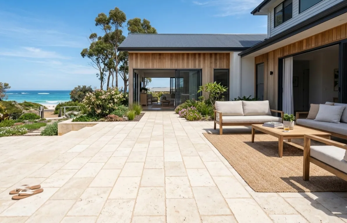 A local favourite. They stay cooler underfoot in summer than dark pavers. Their creamy colour matches the beach vibe. They are durable and cost-effective.