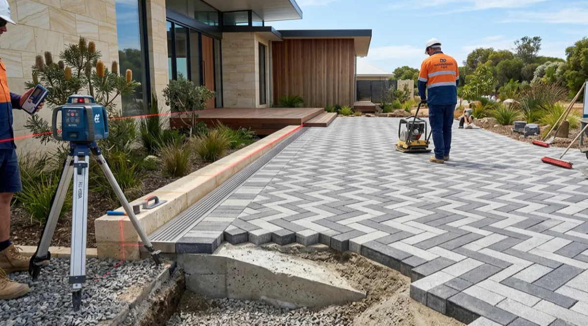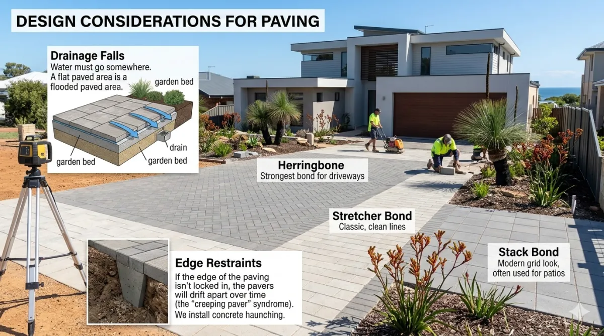 Water must go somewhere. We use laser levels to set the falls. We ensure water runs away from your house foundations and towards garden beds or drains. A flat paved area is a flooded paved area.